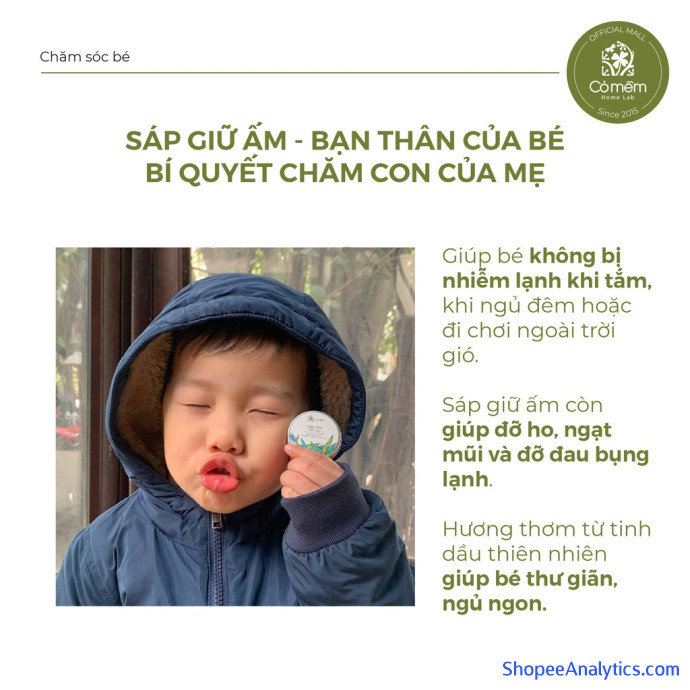 SÁP GIỮ ẤM giúp bé không bị nhiễm lạnh khi tắm, khi ngủ đêm hoặc đi chơi ngoài trời gió. Sáp giữ ấm còn giúp giảm ho, ngạt mũi và đỡ đau bụng lạnh. Ngăn côn trùng đốt. Hương thơm thiên nhiên thư giãn giúp bé ngủ ngon.