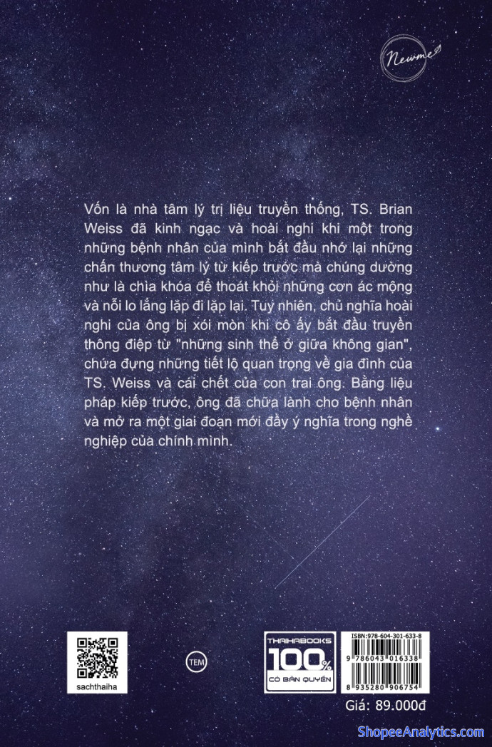 Cuốn sách hay và khiêu khích suy nghĩ này đã phá vở những rào cản trong trị liệu tâm lý truyền thống và trình bày một biện pháp trị liệu cách tân và hiệu quả cao. Những ai làm việc chuyên về sức khỏe tâm thần cần phải xem xét nó nghiêm túc.” – Edith Fiore, TS., bác sỹ tâm lý học lâm sàng và là tác giả cuốn sách Bạn từng ở đây trước kia (You Have Been Here Before) Vốn là nhà tâm lý trị liệu truyền thống, TS. Brian Weiss đã kinh ngạc và bi quan khi một trong những bệnh nhân của mình bắt đầu nhớ lại những chấn thương trong kiếp trước mà chúng dường như là chìa khóa để giải quyết những cơn ác mộng và lo lắng lặp đi lặp lại. Tuy nhiên, chủ nghĩa bi quan của ông bị xói mòn khi cô ấy bắt đầu phát những thông điệp từ “những sinh thể ở giữa không gian,” chứa đựng những tiết lộ quan trọng về gia đình của TS. Weiss và cái chết của con trai ông. Bằng biện pháp kiếp trước, ông có khả năng chữa lành cho bệnh nhân và mở ra một giai đoạn mới đầy ý nghĩa trong nghề nghiệp của chính mình. “Tường thuật xúc động sâu xa về sự tĩnh thức tâm linh ngoài dự liệu của một ngừoi đàn ông. Cuốn sách rất can đảm này đã mở cánh cửa cho một cuộc hôn phối giữa khoa học và siêu hình học. Cuốn sách phải đọc vì một thế giới khát khao, tìm kiếm linh hồn.” – Jeanne Avery, tác giả của Chiêm tinh học và tiền kiếp (Astrology and Your Past Lives) “Một trường hợp xuất thần lịch sử chứng minh tính hiệu quả của liệu pháp kiếp trước. Cuốn sách này sẽ mở ra những cánh cửa cho nhiều người chưa bao giờ nghĩ đến tính hợp lý của việc đầu thai trở lại.” – Richard Sutphen, tác giả của Tiền kiếp, tình yêu tương lai và bạn được sinh trở lại để được bên nhau (Past Lives, Future Loves and You Were Born Again to Be Together) TS. Brian L. Weiss, bác sỹ tâm thần học, sống và làm việc ở Miami, Florida. Ông tốt nghiệp trường đại học Columbia và trường y khoa của đại học Yale và là Chủ tịch Danh dự Tâm thần học của Trung tâm Y khoa Núi Sinai ở Miami. TS. Weiss vẫn có phòng trị liệu riêng ở Miami và tổ chức những hội nghị quốc tế, hội thảo trải nghiệm cũng như những chương trình huấn luyện cho những người hành nghề chuyên nghiệp. Ông cũng là tác giả của Đi qua thời gian để chữa lành (Through Time Into Healing) và Linh hồn cũ xác thân mới. Thông tin về tác giả: Brian L. Weiss, M.D Sau khi tốt nghiệp hạng ưu, trường đại học Columbia và nhận văn bằng y khoa tại trường y khoa của đại học Yale, Brian L. Weiss, TS. Y khoa (MD) tham dự chương trình nội trú tại Trung tâm Y khoa Bellevue, đại học New York, và thăng bậc thành bác sỹ nội trú trưởng, Khoa tâm thần, trường y khoa của đại học Yale. Hiện TS. Weiss là chủ tịch khoa tâm thần tại Trung tâm Y khoa Núi Sinai, vùng duyên hải Miami bang Florida và là trợ lý giáo sư lâm sàng khoa tâm thần, trường y của đại học Miami. Ông chuyên nghiên cứu và trị liệu tình trạng lo lắng và trầm cảm, rối loạn giấc ngủ, rối loạn lạm dụng chất gây nghiện, bệnh Alzheimer và hóa học não.
