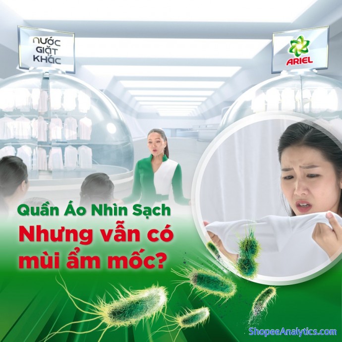 *Ariel Khử Mùi Ẩm Mốc: Ngăn mùi hôi - Khử ẩm mốc và vi khuẩn. Bảo vệ quần áo khỏi mùi hôi cả ngày dài. Ngăn chặn vi khuẩn sinh sôi trên áo quần