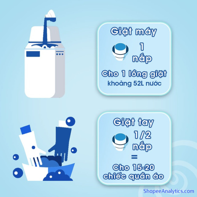 Giặt tay: Sử dụng 1/2 nắp cho một lần giặt với 15-20 chiếc áo quần.