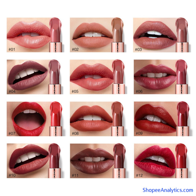 1. Màu sắc phong phú, nuôi dưỡng đôi môi, 12 màu có sẵn, từ màu trang điểm màu nude, màu hạt dẻ, đến màu đỏ tươi, màu sắc trung thực mà không bị nhòe, bị lem hoặc phai màu.
