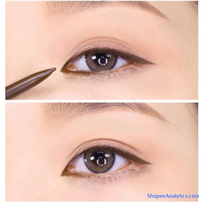 - Bước 3 : Từ đuôi mắt, dùng cọ vẽ một đường xéo hướng về phía đuôi chân mày (tùy thuộc vào độ xếch bạn mong muốn mà vẽ đường xéo dài hoặc ngắn), sau đó vẽ một hình tam giác nhỏ từ đường xéo nối đến điểm kết thúc của đường kẻ sát mí vừa kẻ.