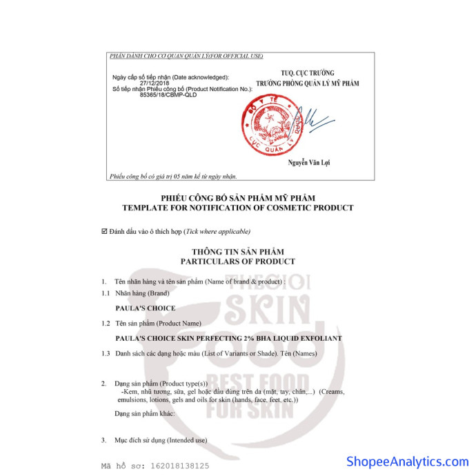 * Thành phần: Water, Methylpropanediol, Butylene Glycol, Salicylic Acid , Polysorbate 20, Camellia Oleifera Leaf Extract, Sodium Hydroxide, Tetrasodium EDTA.