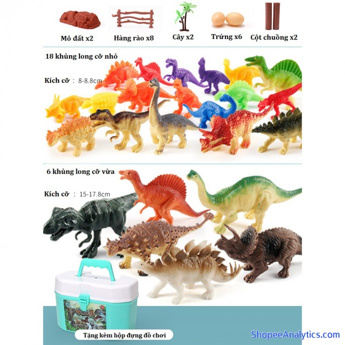 Số lượng: 24 con khủng long lớn nhỏ,Tặng kèm 20 chi tiết cây lá và viên đá.