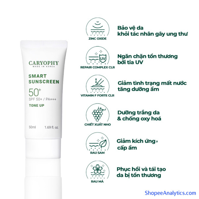 - Caryophy Smart Sunscreen có hiệu quả vượt trội trong việc dưỡng trắng da và chống oxy hoá.