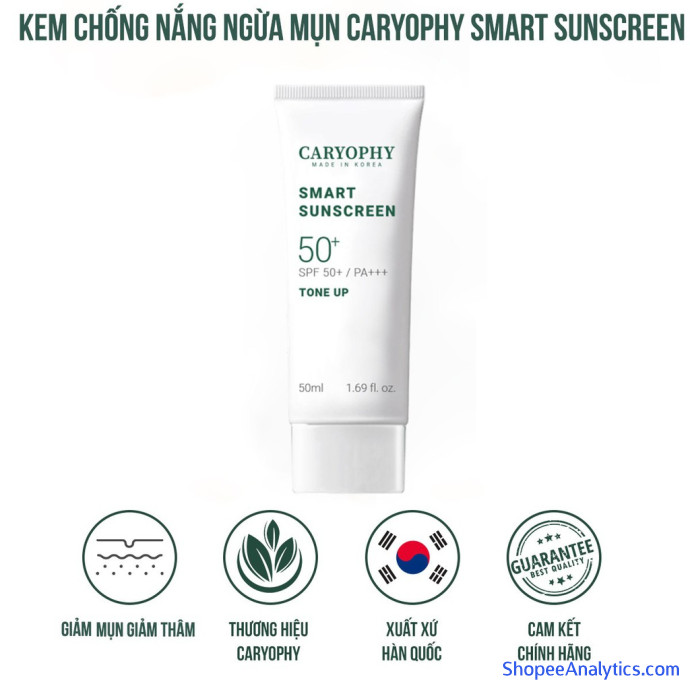 Kem chống nắng thông minh Caryophy Smart Sunscreen Tone Up là dòng kem chống nắng vật lý bảo vệ da khỏi tia UV bằng cách tạo lớp chắn trên bề mặt da rồi khuếch tán và phản xạ lại tia UV ngăn không cho chúng xuyên thấu vào da. Chống thấm nước cao, nâng tone nhẹ da và hỗ trợ ngăn ngừa mụn giảm thâm hiệu quả.