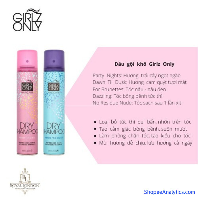 Nhờ dầu gội khô Girlz Only mà các nàng không cần phải lo về vấn đề đó nữa. Dầu Gội Khô GIRLZ ONLY Dry Shampoo là dòng sản phẩm từ Anh của thương hiệu GIRLZ ONLY với chất lượng châu Âu nhưng giá vô cùng bình dân. Chỉ sau 2 phút là tóc bết dầu biến mất trả lại mái tóc sạch dầu, bồng bềnh chuẩn không cần chỉnh.