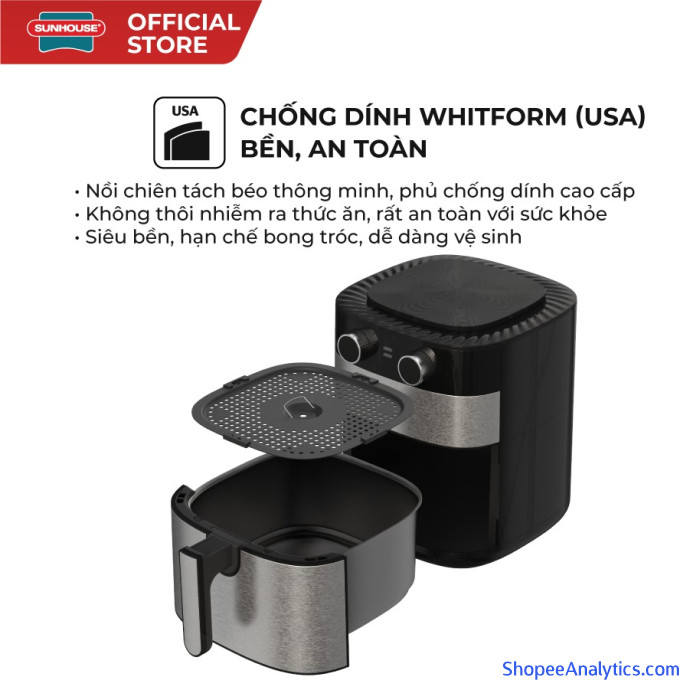 Quan trọng nhất đối với các thiết bị dùng để chiên rán là chất lượng lớp chống dính. Khay chiên của nồi chiên không dầu 6L SUNHOUSE SHD4026 đều được phủ chống dính Whitfrod (USA) siêu bền, khó bong tróc và nhất là không thôi nhiễm ra thức ăn, rất an toàn với sức khỏe.
