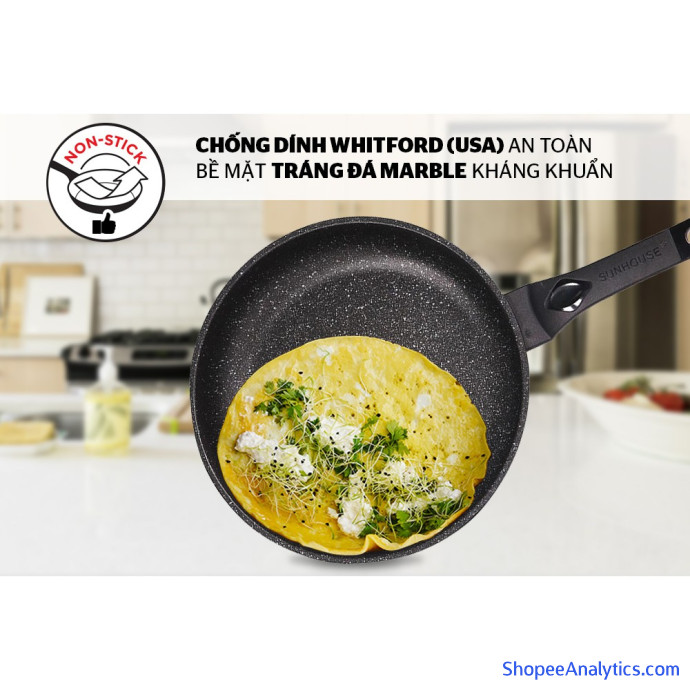 An toàn cho sức khỏe: Chảo siêu bền đá sâu SUNHOUSE phủ 3 lớp chống dính Whitford (USA), an toàn tuyệt đối, không có tình trạng thôi nhiễm vào thức ăn. Lớp chống dính đá hoa cương ở trên cùng có khả năng kháng khuẩn và tăng khả năng chống dính, chống trầy xước.