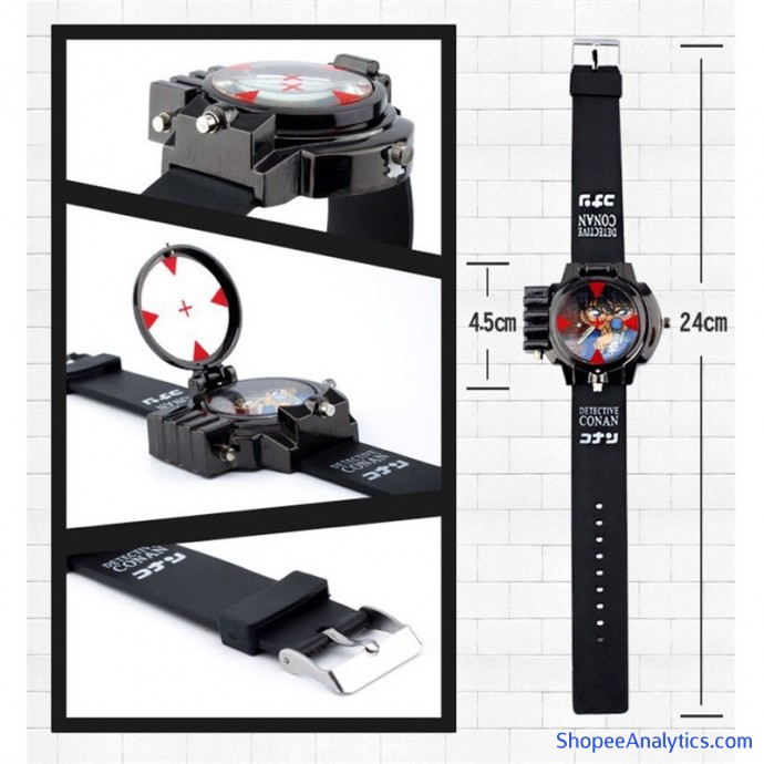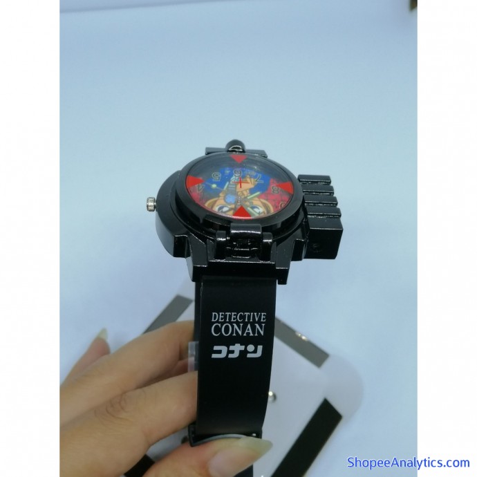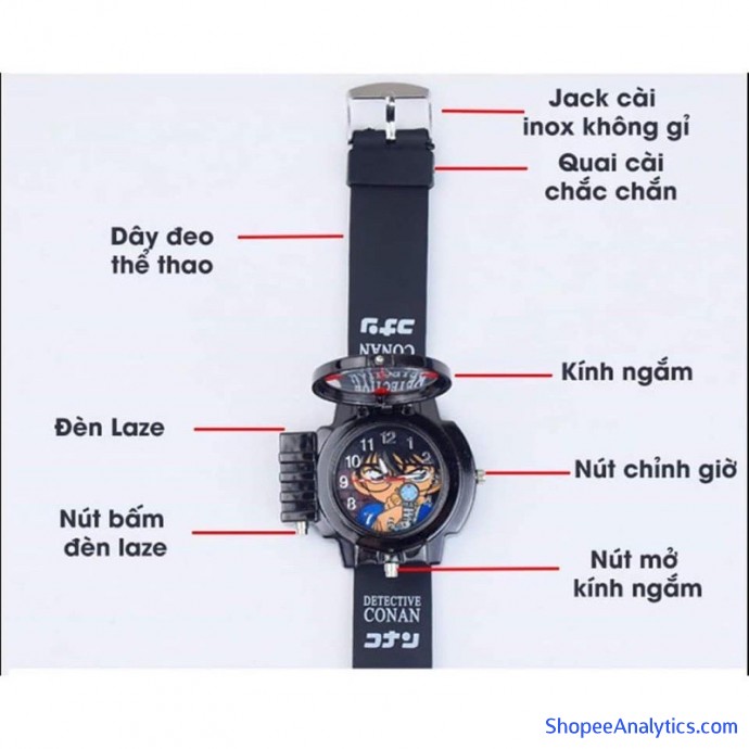 Đồng hồ CONAN được thiết kế chi tiết bằng nhựa an toàn, sử dụng pin Lithium 3V. Mặt đồng hồ in hình thám tử Conan. Dây đeo cao su rất bền. Ngoài ra thì đồng hồ còn có mặt kính hình ống ngắm như chiếc đồng hồ Conan vẫn thường dùng trong lúc phá án và một đèn chiếu lazer cực chất.