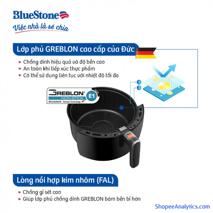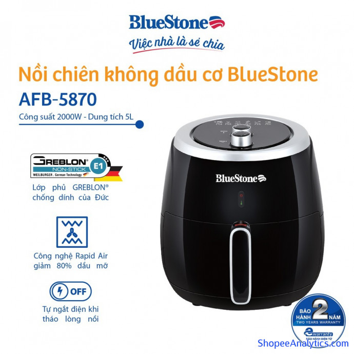 Nồi chiên Bluestone với dung tích lên đến 5.0 lít giúp bạn có thể chiên thức ăn với khối lượng lớn, dày dành cho nhiều người. Dung tích lớn giúp bạn có thể thực hiện những món ăn ở dạng nguyên con như gà, vịt.