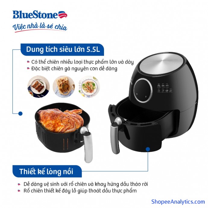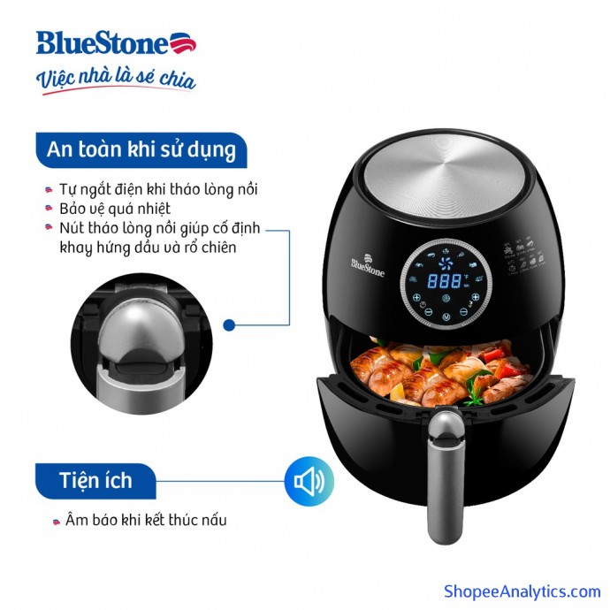 Nồi chiên Bluestone với dung tích lên đến 5.5 lít giúp bạn có thể chiên thức ăn với khối lượng lớn dành cho nhiều người. Với khả năng nấu nướng đa dạng, nồi chiên có thể sử dụng dùng để làm các món chiên, nướng đa dạng như: khoai tây chiên, cánh gà nướng, khoai lang nướng, thịt nướng và làm bỏng ngô, hâm nóng lại đồ ăn.