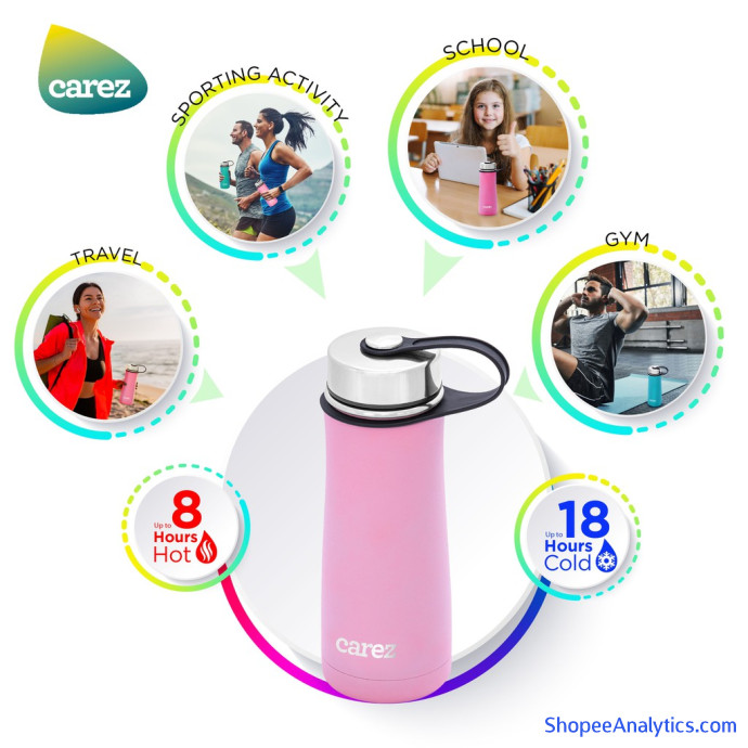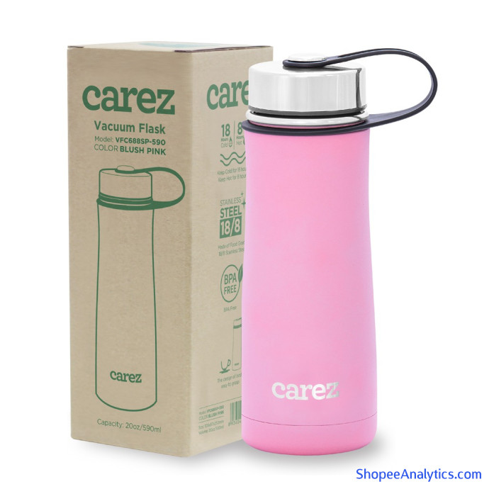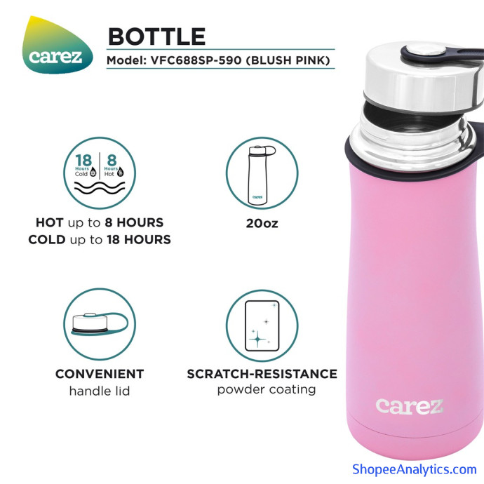 - Bình giữ nhiệt Carez model VFC688SP-590 với màu hồng san hô trẻ trung, tươi tắn, thiết kế nắp dạng xoay có quai xách thanh lịch, tiện lợi để treo móc và mang đi, phù hợp để đồng hành cùng bạn khi vận động và thể dục thể thao mỗi ngày.