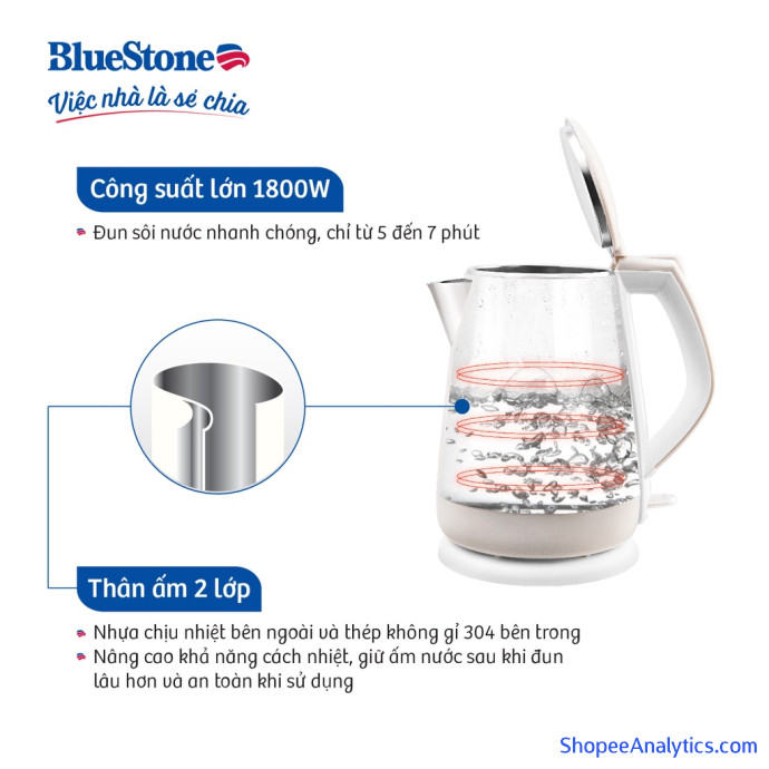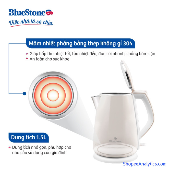 Ấm Đun Siêu Tốc 2 Lớp Bluestone KTB-3351B - 1.5L đi kèm hệ thống nung nóng bằng mảnh nhiệt phẳng là thép 304 không gỉ sét cùng công suất 1800W giúp đun sôi nhanh chóng, đáp ứng nhu cầu sử dụng của cả gia đình mà vẫn tiết kiệm thời gian.