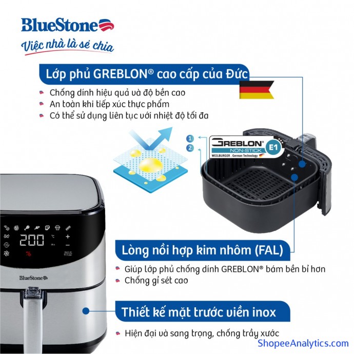 Rổ chiên, khai hứng dầu: Hợp kim nhôm phủ lớp chống dính Greblon từ Đức
