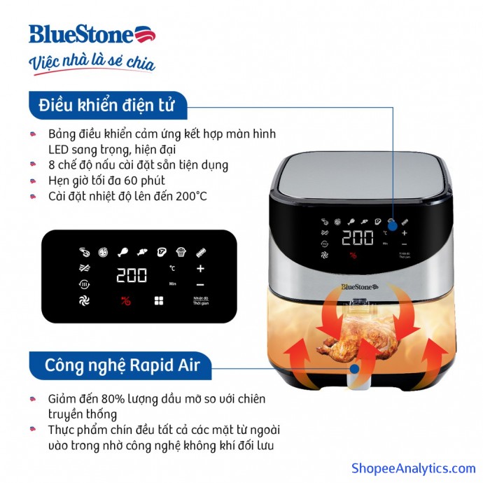 Nồi Chiên Không Dầu BlueStone AFB-5880 (5,5 Lít) sử dụng công nghệ chiên/nướng đối lưu Rapid Air - giảm 80% lượng dầu mở dư thừa.