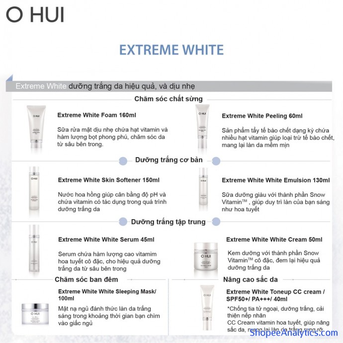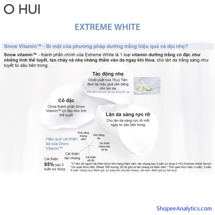 Chứa thành phần vitamin từ nấm tuyết hàm lượng cao cùng công nghệ độc đáo giúp dưỡng chất hấp thụ nhanh chóng qua da, không những giúp dưỡng trắng da mà còn ngăn ngừa nám và ngăn chặn lão hoá, cho làn da sáng trong, rạng rỡ. Nấm tuyết chứa các vitamin A, B, E và C có tác dụng trong việc ngăn ngừa nám và tàn nhang, đồng thời giúp làn da sáng mịn tươi trẻ, làm chậm quá trình lão hóa và giảm thiểu các nếp nhăn. Ngoài ra, chiết xuất từ hoa thuỷ tiên trắng trong OHUI Extreme White Cream cũng có tác dụng làm trắng da và làm dịu da tuyệt vời.