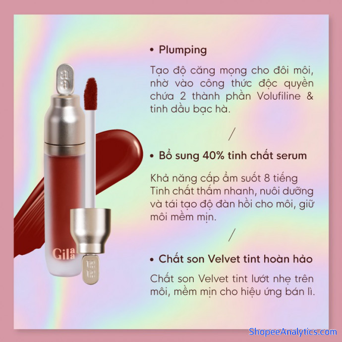 Tổng thể Son Gilaa Plumping Lip Serum - Phiên bản Velvet Tint Hoàn Hảo (3.8g) được đánh giá trung bình 4.95/5 điểm dựa vào 2,578 đánh giá qua 6,625 lượt mua hàng (Cập nhập ngày 25/08/2021).