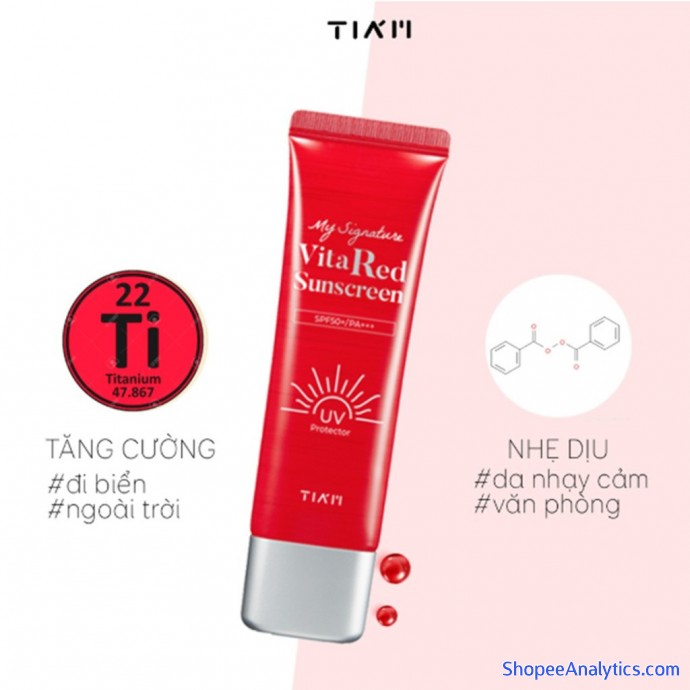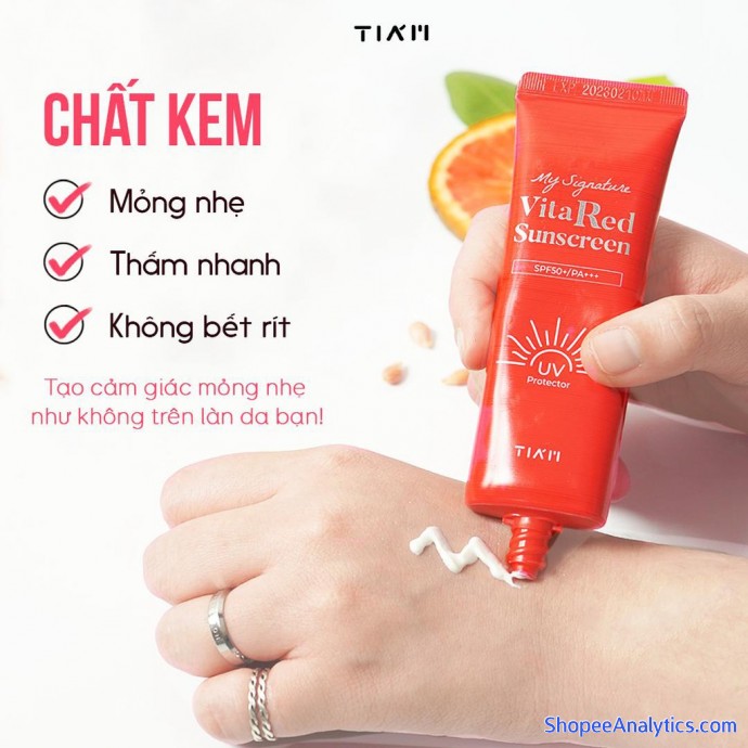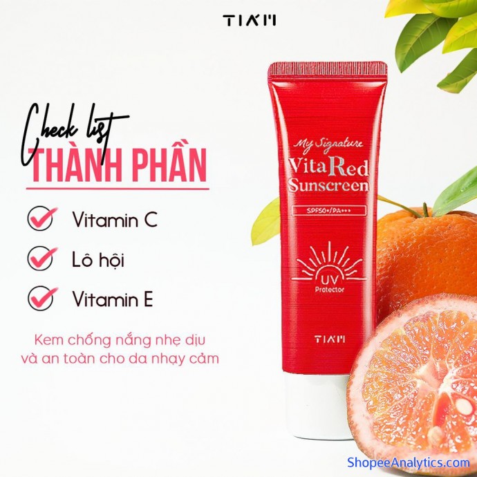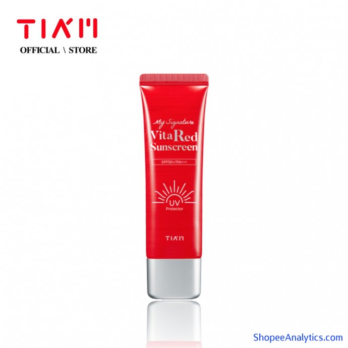 Kem chống nắng dưỡng trắng Tia'm My Signature Vita Red Sunscreen với SPF 50/PA+++ cùng thành phần chính là Vitamin C, Lô hội, Vitamin C giúp làm dịu da, dưỡng trắng, chống nắng cực mạnh, là một trong những sản phẩm không thể thiếu của những tín đồ làm đẹp Hàn Quốc.