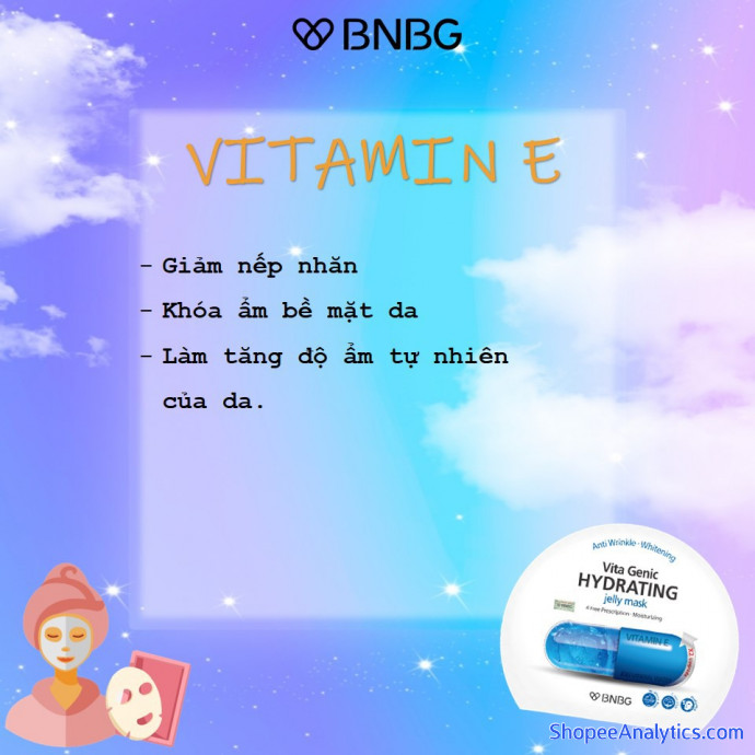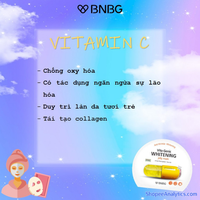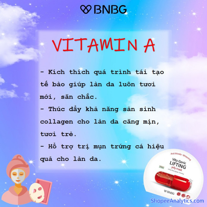 Mặt nạ #BNBG chứa các loại Vitamin A, B3, B5, C, E, F, H, Q... cho da với hàm lượng cao lên đến 20000ppm được chiết xuất hoàn toàn từ thiên nhiên. Đây đa phần là các vitamin rất hiếm, tốt cho da. Các tinh chất từ cây, quả thiên nhiên như tinh chất trái cam, lô hội, việt quất... giúp tăng sữa đề kháng và trẻ hóa làn da.