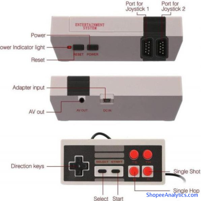 Máy chơi game 2 tay cầm 4 nút. (Một số phiên bản giá rẻ chỉ có 2 nút hoặc 500 trò chơi)