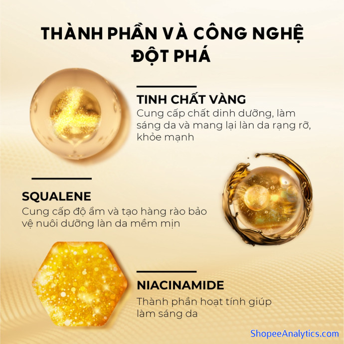 Công dụng: Nước cân bằng tinh chất vàng với lá vàng thật 24k nhẹ nhàng tan và thấm vào da nuôi dưỡng làn da khô và thô trở nên rạng rỡ, sáng mịn hơn. Với các hydrat hóa không chỉ cung cấp ẩm mà còn giữ da ngậm nước.