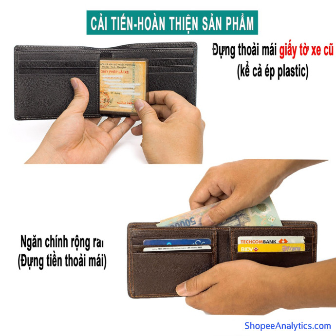 + Ngăn phụ: 2 bên có tới 6 ngăn phụ đựng thẻ (step thẻ).2 ngăn to đựng được cả giấy tờ CŨ, cà vẹt xe CŨ