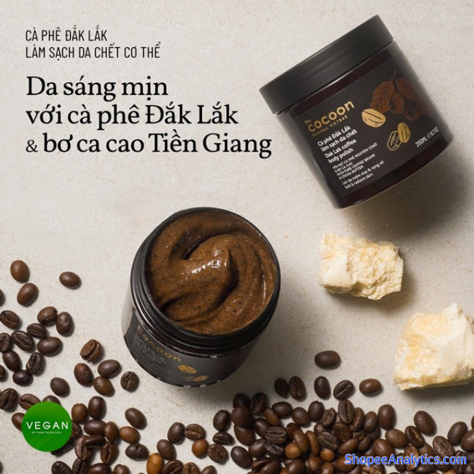 Sản phẩm được tạo từ những hạt cà phê Đăk Lăk nguyên chất xay nhuyễn, hòa quyện cùng bơ cacao Tiền Giang giúp loại bỏ tế bào chết hiệu quả, làm đều màu da, mang lại năng lượng, giúp da trở nên mềm mại và rạng rỡ.