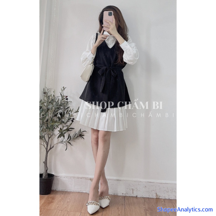 - Nếu bạn là một cô nàng GENZ thời thượng, nhất định bạn không thể bỏ qua chiếc Set váy sơ mi trắng xếp ly và yếm đen dáng dài thắt đai eo thần thánh này nhé