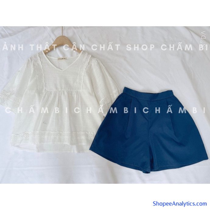 ✪ Chất liệu Set bộ nữ S.060, Set áo babydoll cổ V pha ren họa tiết cùng quần short xanh: áo chất thô boii