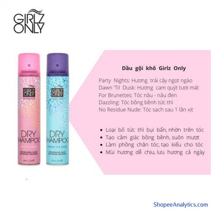 Girlz Only là dòng sản phẩm chăm sóc tóc chuyên về dầu gội khô đến từ Anh Quốc. Hướng đến những người phụ nữ hiện đại với bộn bề công việc, Girlz Only chính là vị cứu tinh cho một ngày bận rộn, giúp làm sạch tóc mà không tốn nhiều thời gian.