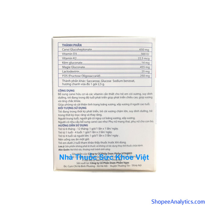 + Calci Glucoheptonate ( canxi hữu cơ) .....................650mg ( 55 mg canxi nguyên tố )