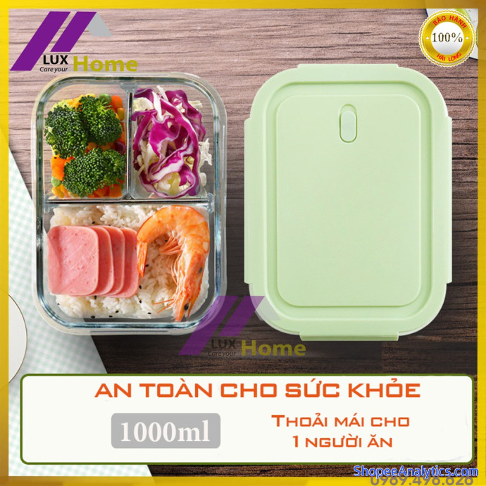 1. Hộp cơm thuỷ tinh chia 2 ngăn hoặc 3 ngăn, có dung tích 1000ml, dùng đựng cơm và thức ăn, đủ cho 1 người ăn no, dù là nam hay nữ. Chất liệu hộp cơm bằng thủy tinh chịu nhiệt từ -20°C đến 400°C. Hộp cơm thuỷ tinh có gioăng Silicon chống tràn và 1 nắp đậy nhỏ, có thể nhấc ra để thoát hơi khi dùng hâm nóng thức ăn mà không bị khó khăn khi mở lắp hộp