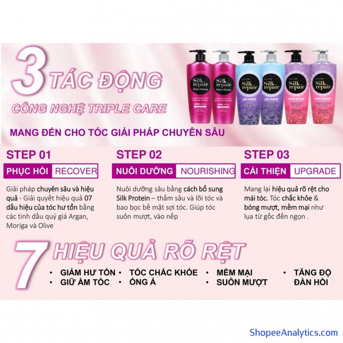 - Hoạt chất Silk Protein: chăm sóc tóc hư tổn bổ sung dưỡng chất cho bề mặt tóc.