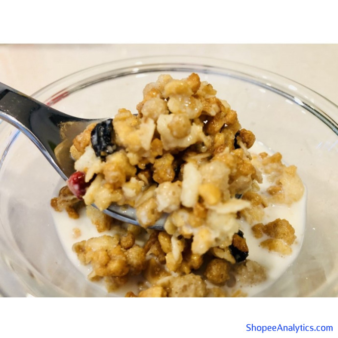 Thành phần: Yến mạch, đường lỏng, bột lúa mạch đen, dừa, maltodextrin, dầu thực vật, bột trái cây sấy khô, bột gạo, chất xơ hòa tan trong nước, quả óc chó , Cornflower, đường maple (100% xi-rô cây phong Canada), hạt bí ngô, quả mâm xôi chế biến (bao gồm các thành phần sữa), muối, cám lúa mì, đường hạt, bột gạo nâu, nước sốt caramel / tinh bột biến đổi, glycerin, hương liệu , Sắt natri citrat, axit hóa, chất nhũ hóa (bao gồm đậu nành), cellulose, chất chống oxy hóa (vitamin E), niacin, natri citrate, canxi pantothenate, vitamin A, vitamin B6, vitamin B1, sắc tố anthocyanin, axit folic, Vitamin D, Vitamin B12