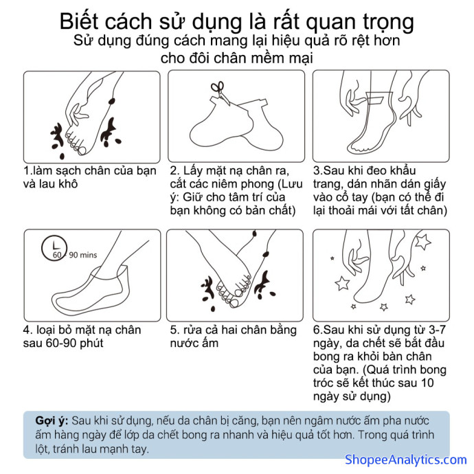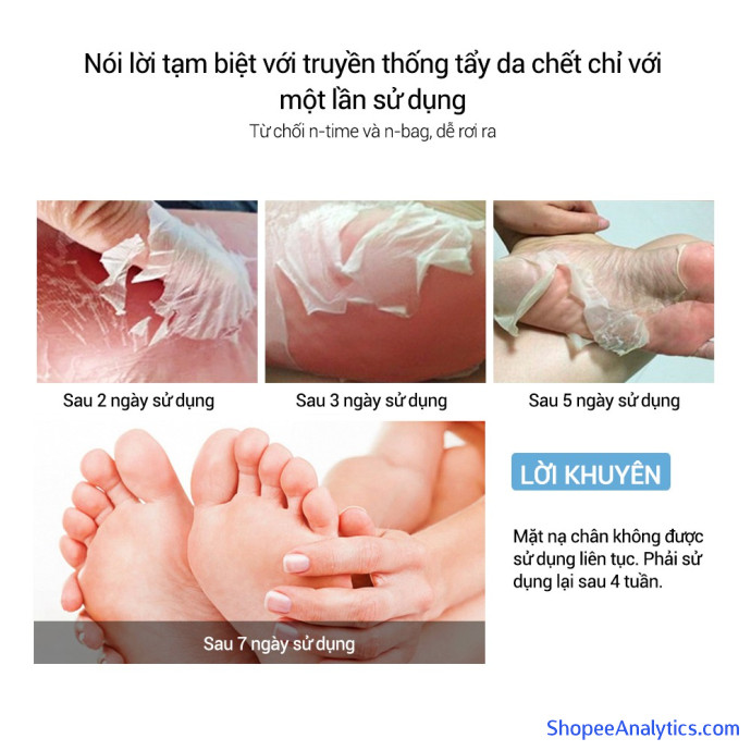Lưu ý: Sau khi sử dụng, nếu da chân bị căng, bạn nên ngâm chân vào nước ấm hàng ngày để đảm bảo lớp da chết bong ra nhanh chóng và mang đến hiệu quả tốt hơn. Trong quá trình bong tróc, tránh lau mạnh hoặc cố tình lột da.
