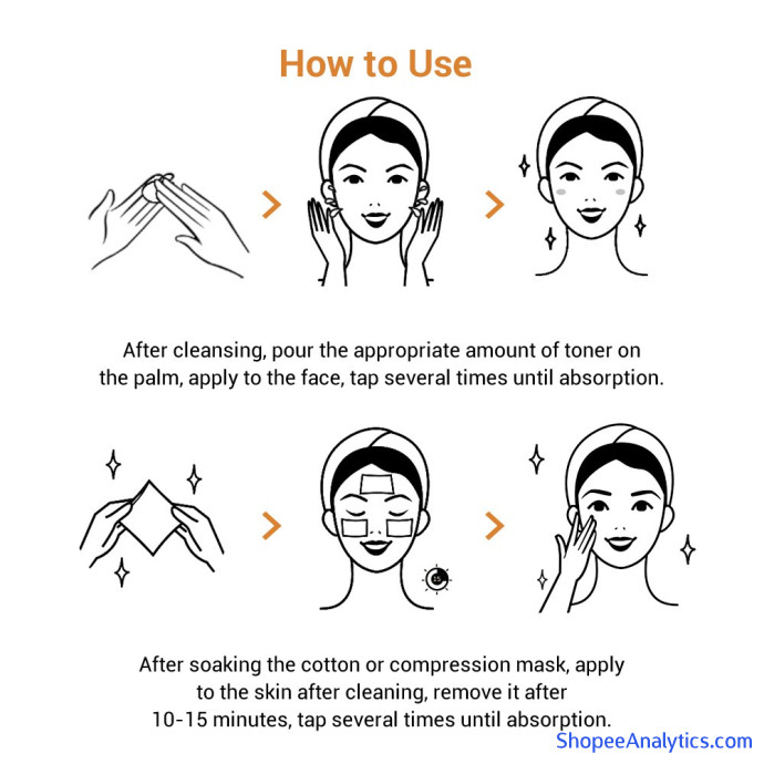 Nhúng miếng bông hoặc mặt nạ nén, đắp lên da sạch, khoảng 5-10 phút sau lấy ra, vỗ nhẹ cho đến khi da hấp thụ hoàn toàn.