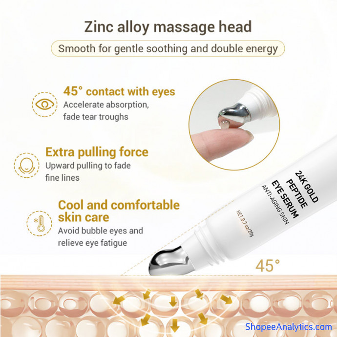 Tinh chất peptit vàng 24K thúc đẩy sản xuất collagen, xây dựng lại mô da, xóa mờ nếp nhăn, cải thiện đường viền mắt, làm căng da, giảm quầng thâm và bọng mắt.