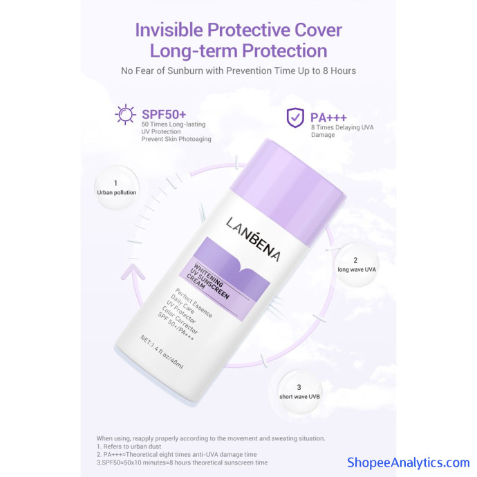 Tổng thể Kem Chống Nắng LANBENA Chống Tia UV Màu Tím Làm Trắng Da Dành Cho Da Mặt SPF50+ 40ml được đánh giá trung bình 4.93/5 điểm dựa vào 364 đánh giá qua 649 lượt mua hàng (Cập nhập ngày 17/10/2021).