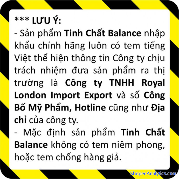 - Sản phẩm Tinh Chất Balance nhập khẩu chính hãng luôn có tem tiếng Việt thể hiện thông tin Công ty chịu trách nhiệm đưa sản phẩm ra thị trường là Công ty TNHH Royal London Import Export và số Công Bố Mỹ Phẩm, Hotline cũng như Địa chỉ của công ty.