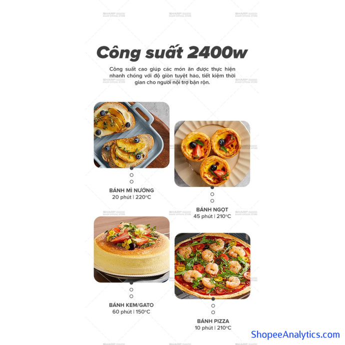 • Công suất 2.400W mạnh mẽ, rút ngắn thời gian nướng
