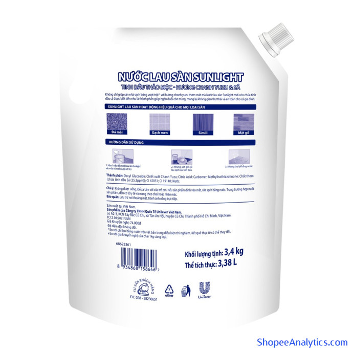 Tổng thể Nước Lau Sàn Sunlight Tinh Dầu Thảo Mộc Hương Chanh Sả Dạng Túi 3.4 Kg được đánh giá trung bình 4.96/5 điểm dựa vào 107 đánh giá qua 334 lượt mua hàng (Cập nhập ngày 17/10/2021).