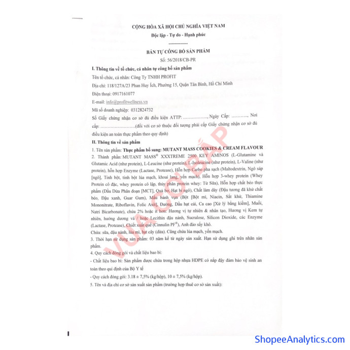 MUTANT MASS XXXTREME 2500 22lbs cung cấp thành phần dinh dưỡng: