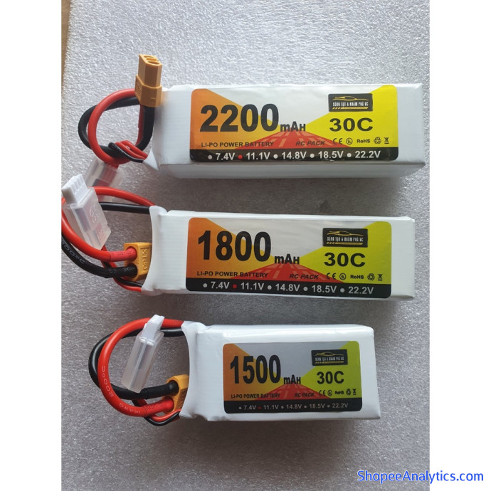 3s (11.1v) 1500mah 30C: 7.5cm*3.8cm*2.5cm. Jack XT60.