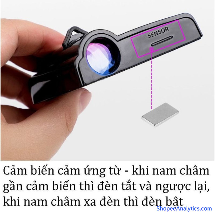 ➤ Bước 2: Đưa miếng nam chân lại gần mặt dưới chữ SENSOR để kiểm tra chức năng tự tắt. Đèn tắt khi nam châm ở gần đèn dưới 1cm, đèn bật khi nam châm cách xa hơn 1cm.