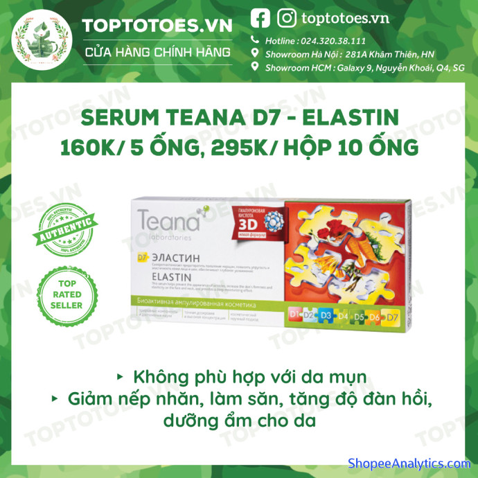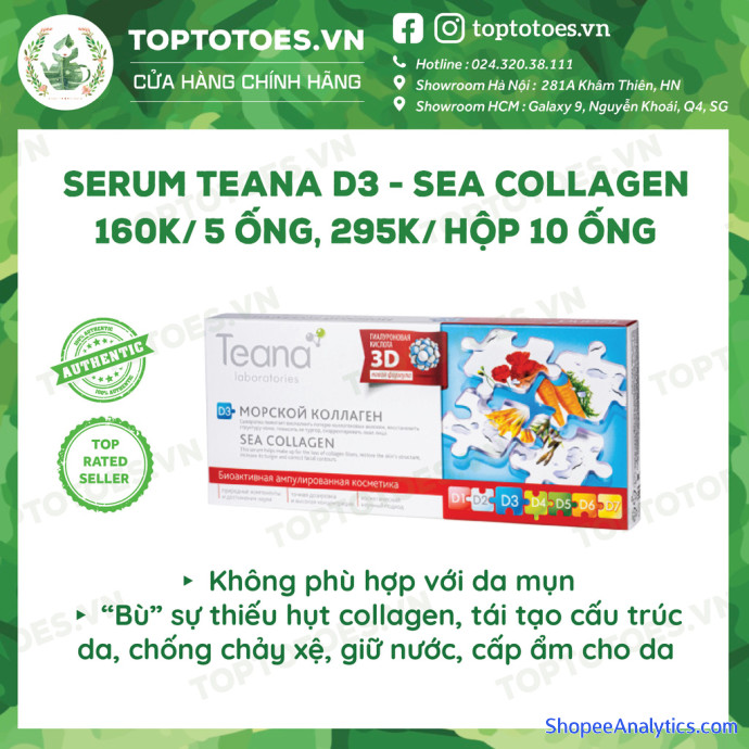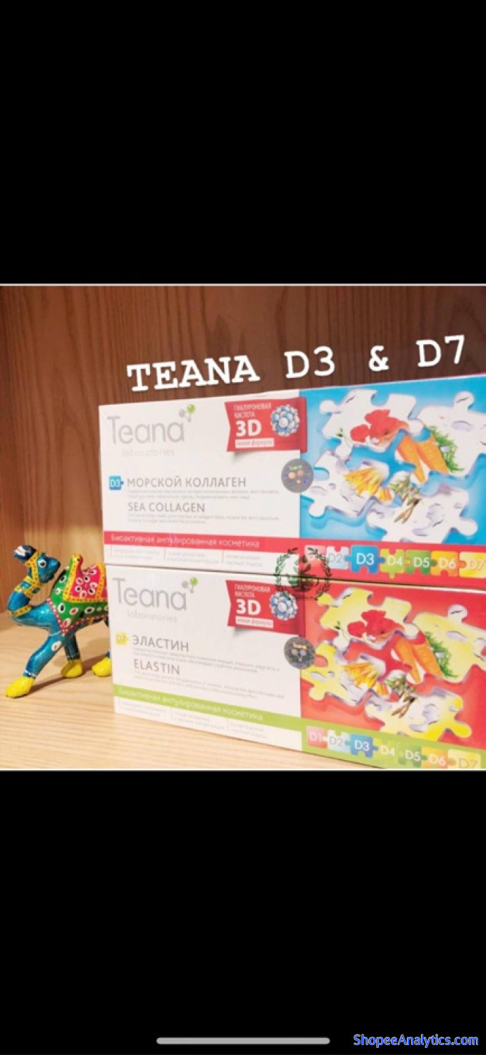 Serum D3 Sea collagen với thành phần là Hyaluronic acid siêu giữ nước cấp ẩm, collagen hoá lỏng, Optiphen BD sẽ “bù” sự thiếu hụt các sợi collagen trên da, tái tạo cấu trúc da, tăng độ căng và và tạo “nét” cho mặt, tức chống chảy xệ các vùng mắt, má, khoé miệng, nọng cằm. D7 với thành phần HA, Elastin hoá lỏng, Otiphen BD sẽ giảm nếp nhăn, làm săn chắc da, tăng độ đàn hồi của mặt và cổ, dưỡng ẩm hiệu quả cho da nhé😚 Điểm đặc biệt là Teana có cấu trúc Hyaluronic acid 3D, khác với cấu trúc thông thường vì bao gồm 3 size khác nhau của HA, có thể thẩm thấu mức cao nhất vào trong da, hỗ trợ đưa collagen và elastin (vốn có cấu trúc phân tử to khá khó thấm vào da) có thể đi vào da dễ dàng hơn và hoạt động mạnh mẽ😚