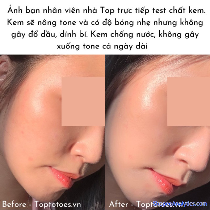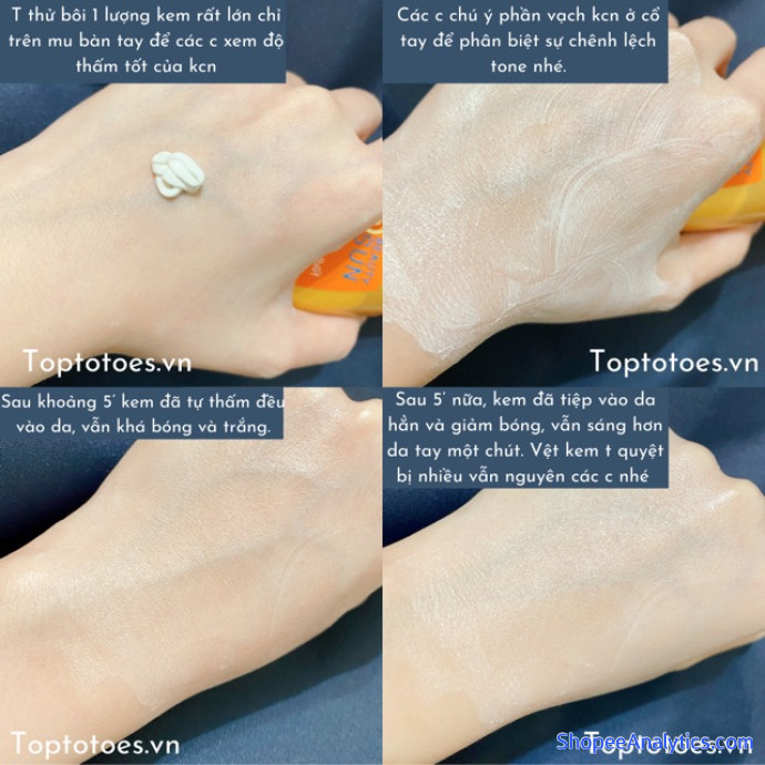 - Vì có màng chống nắng vật lý nên e ấy sẽ nâng tone da trắng nhẹ sau khi apply, tuy nhiên đợi một lúc da sẽ về gần với màu da ban đầu chứ không bị trắng bệch như một số kcn thuần vật lý các c nha. Ưu điểm lớn là da gần như không hề bị xuống tone cả ngày dài.