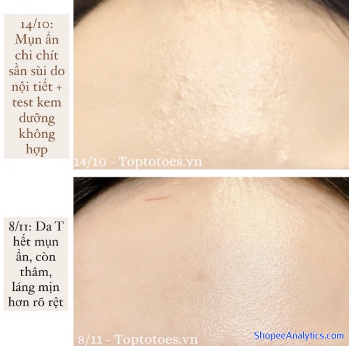• Để biết t yêu nó thế nào thì các c trượt ảnh xem tình trạng trán t lúc 14/10 và bây giờ nhé=))) Vừa do ăn ngủ linh tinh, vừa do đợt này Nga khô, t lên cơn hâm tranh thủ test 1 đống dưỡng ẩm mới nặng đô, không hợp + bí da lên mụn be bét luôn :). 14/10 trán t đúng kiểu chi chít mụn ẩn, sần sùi rõ lắm luôn dù t chụp cam trước hơi mờ. Ảnh 8/11 rõ từng lỗ chân lông thì chắc các c thấy mụn ẩn của t bay sạch rồi🤣. Vẫn còn thâm nhưng từ từ hic thế này là tốt rồi. Cả đợt t chỉ dùng srm & toner Compliment và kem dưỡng Bielenda Dr Medica Anti-acne để vừa giảm mụn vừa dưỡng ẩm, thỉnh thoảng tẩy da chết hay đắp mask detox nữa. T không dùng kem bôi mụn để dễ theo dõi hiệu quả của srm và toner. Mụn ẩn của t được đẩy lên nhẹ nhàng và nhanh chóng, đầu mụn rất khô luôn.