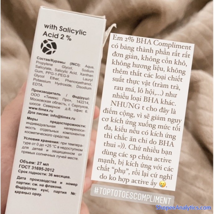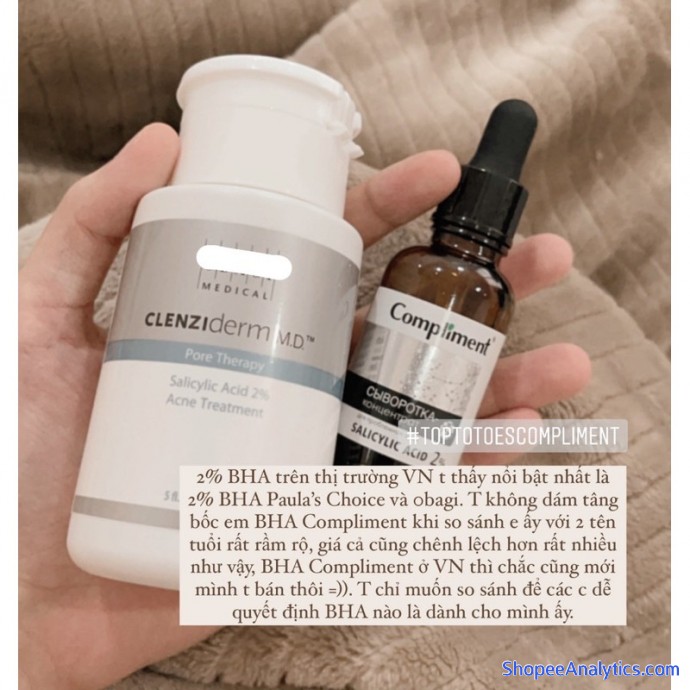 • Em 2% BHA Compliment có bảng tp rất rất đơn giản, không cồn khô, không hương liệu, không thêm thắt thêm các loại chiết suất thực vật (tràm trà, rau má, lô hội,...) như nhiều loại BHA khác. NHƯNG t cho đây là điểm cộng, vì sẽ giảm nguy cơ kích ứng xuống mức tối đa, kiểu nếu có kích ứng thì chắc ăn chỉ do BHA thui =)). Chứ nhiều bạn dùng các sp chứa active mạnh, bị kích ứng với các chất “phụ”, rồi lại cứ nghĩ do ko hợp active ấy 🥲.