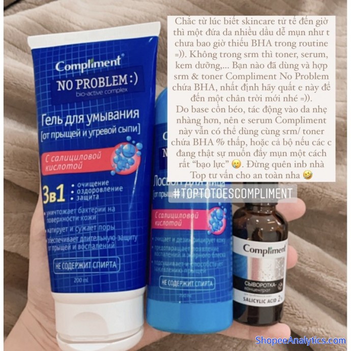 • Chắc từ lúc biết skincare tử tế đến giờ thì một đứa da nhiều dầu dễ mụn như t chưa bao giờ thiếu BHA trong routine =)). Bạn nào đã dùng và hợp srm & toner Compliment No Problem chứa BHA, nhất định hãy quất e này để đến một chân trời mới nhé =)). Các c nhớ trượt ảnh xem thành quả t tự cứu bản thân khỏi mụn ẩn nha 💪🏻.
